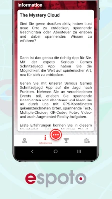 espoto mobile serious games ist eine Softwarelösung, die den Rahmen für eine Vielzahl von Location-Based Game und Quiz Anwendungen bildet - darunter in den Bereichen Teamevent, Tourismus, Bildung und Unternehmenskommunikation - Indoor, Outdoor wie auch Online. Mit unserer Technologie bekommen Sie eine der leistungsfähigsten Softwarelösungen und erstellen im Handumdrehen und ganz ohne Programmierkenntnisse digitale Schnitzeljagden, Schatzsuchen, Stadtführungen, Outdoor Escape Games, JGA Spiele, Amazing Races, Quiz Events, Online Escape Games, BreakoutEdu Anwendungen u.v.m. Und mit unser App laden wir Sie hiermit recht herzlich dazu ein, eben jene Anwendungen zu entdecken!