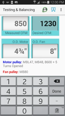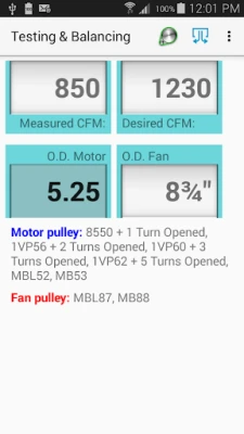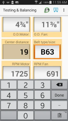 Using 'Testing&Balancing: Belt Drive' Technicians can calculate the outside diameter (O.D.) of the fan pulley and / or motor pulley required to achieve a given rpm. The program will recommend the size of the belt, which is suitable for a given center-to-center distance.